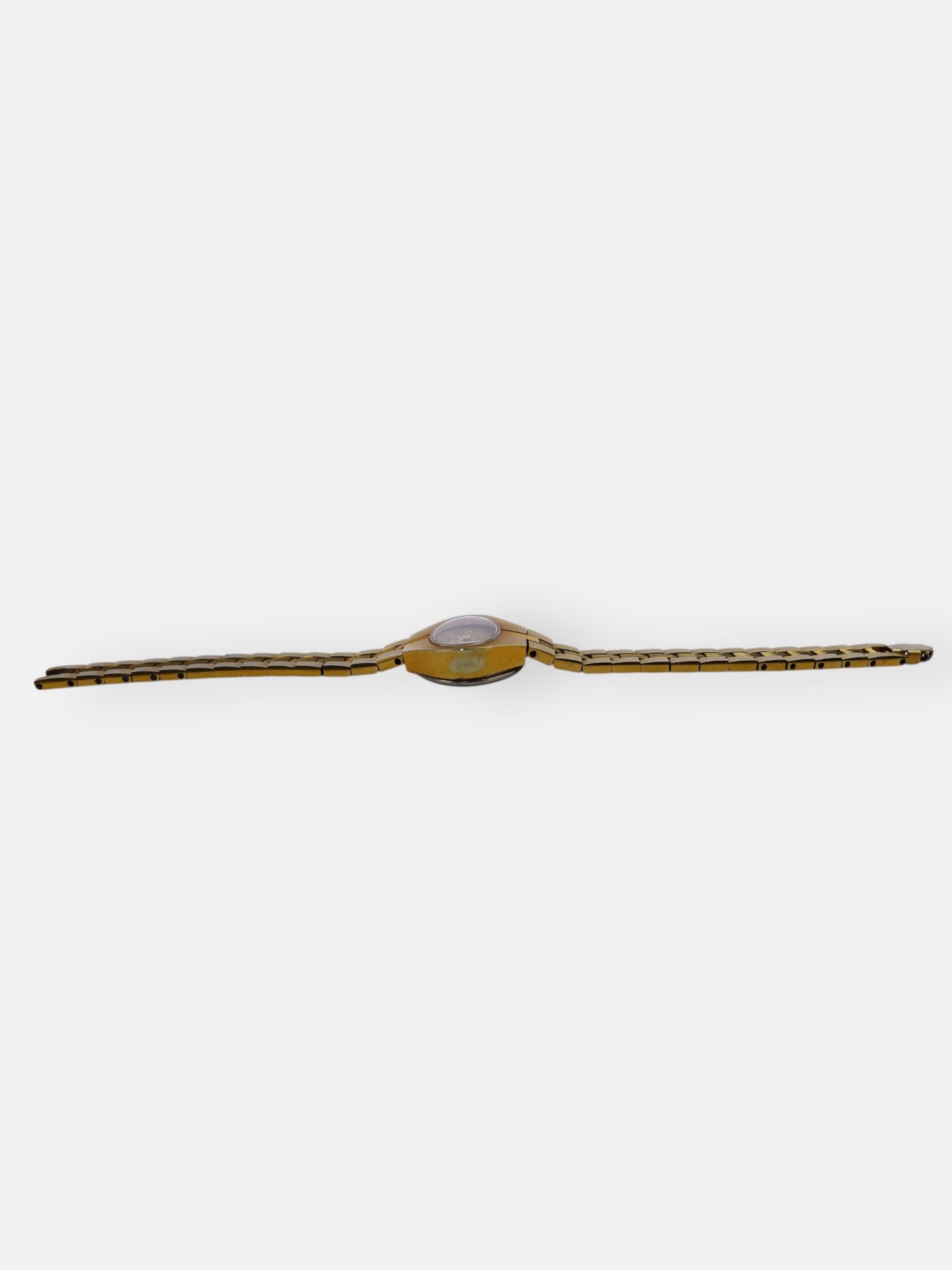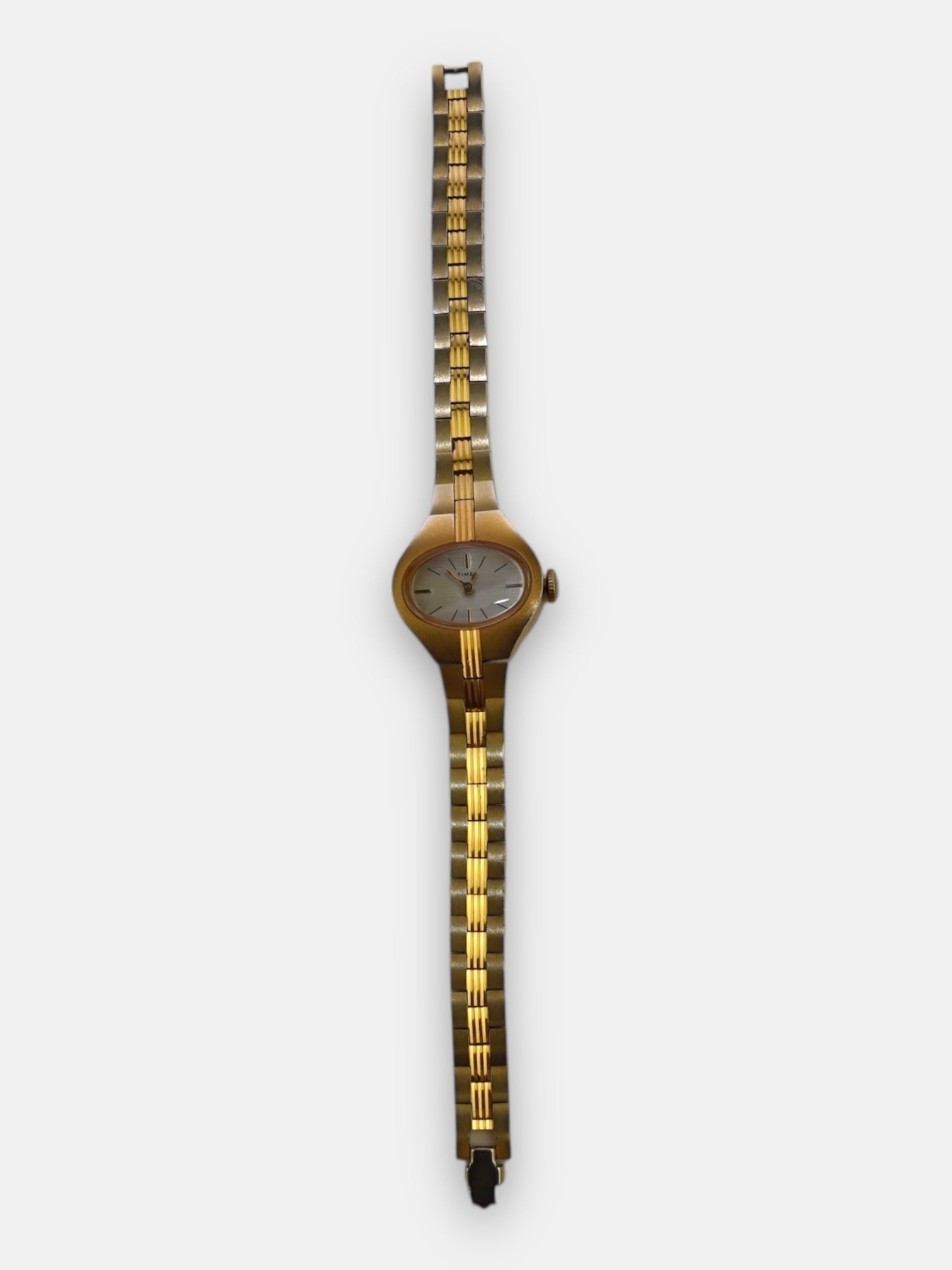 This vintage Timex watch features a gold-accented band running down the center shining at every angle.